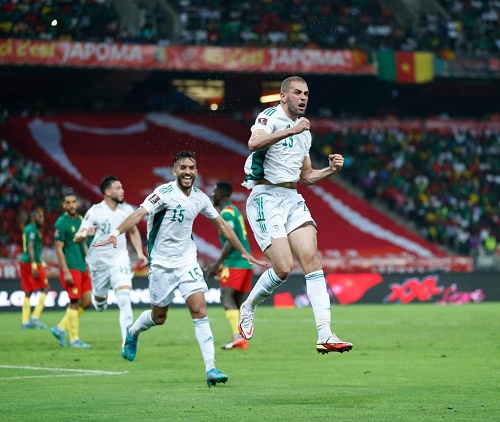 قاد إسلام سليماني، الهداف التاريخي للمنتخب الوطني، ونجم نادي سبورتينغ لشبونة البرتغالي، "الخضر" للفوز على المنتخب الكاميروني، في ذهاب الدور الفاصل المؤهل لنهائيات